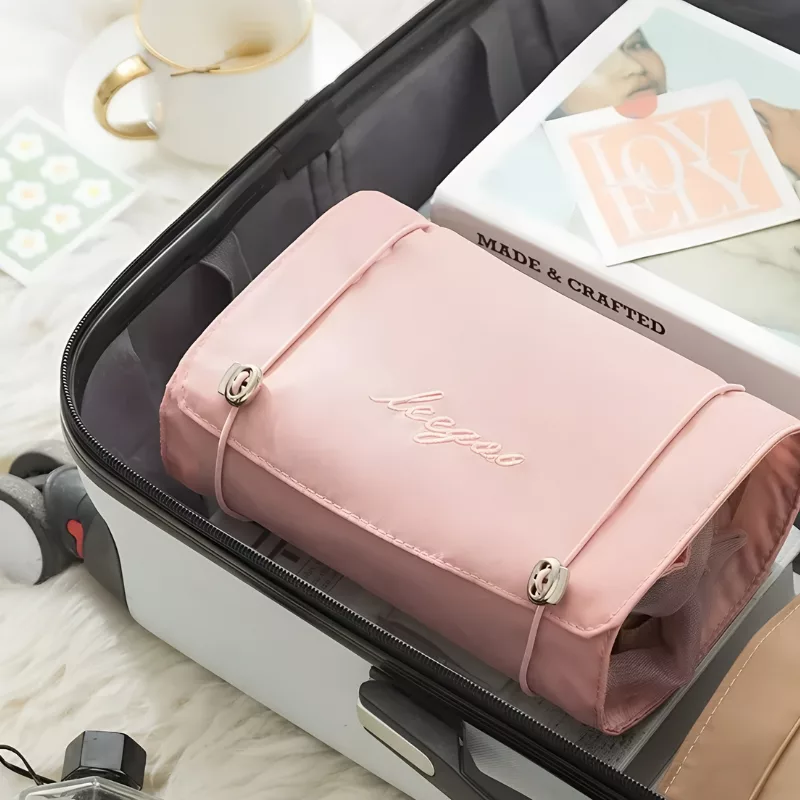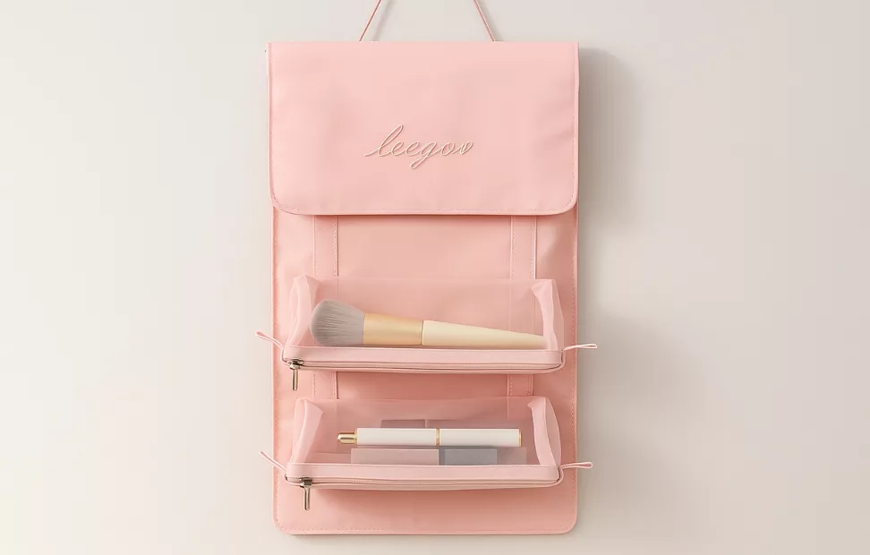 This folding makeup bag can be fixed on doors, towel bars, or hooks. This makes the contents easy to see and grab and helps save space on the counter.
