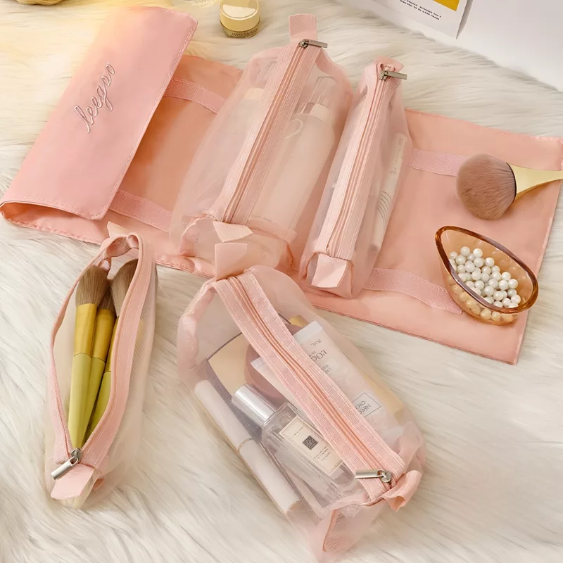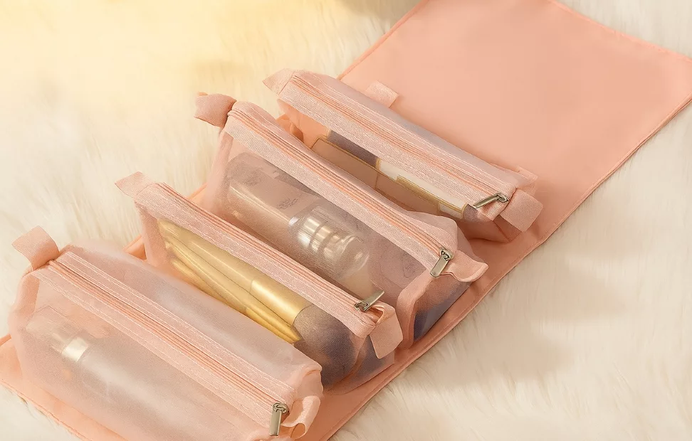 The zippered pouches snap on and off quickly, letting you pack only what you need. It is great for separating skincare, haircare, and makeup essentials.